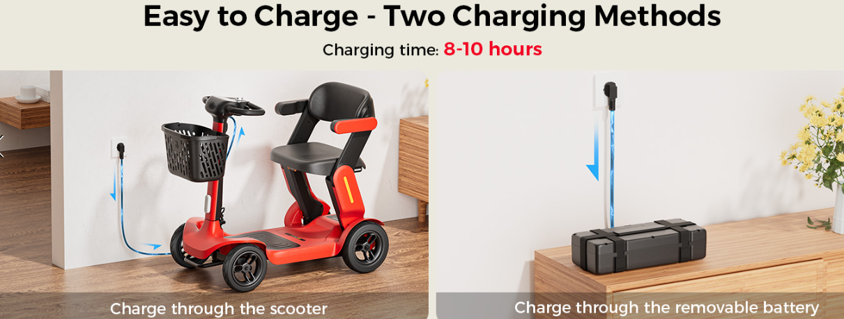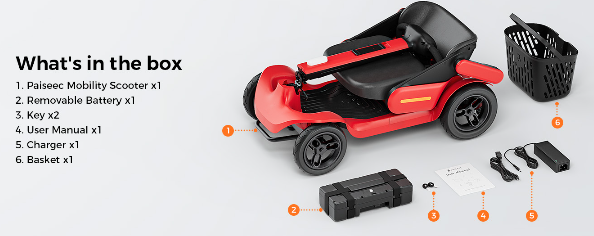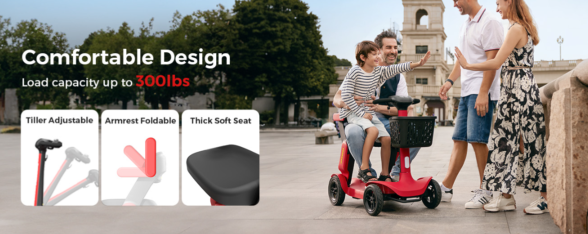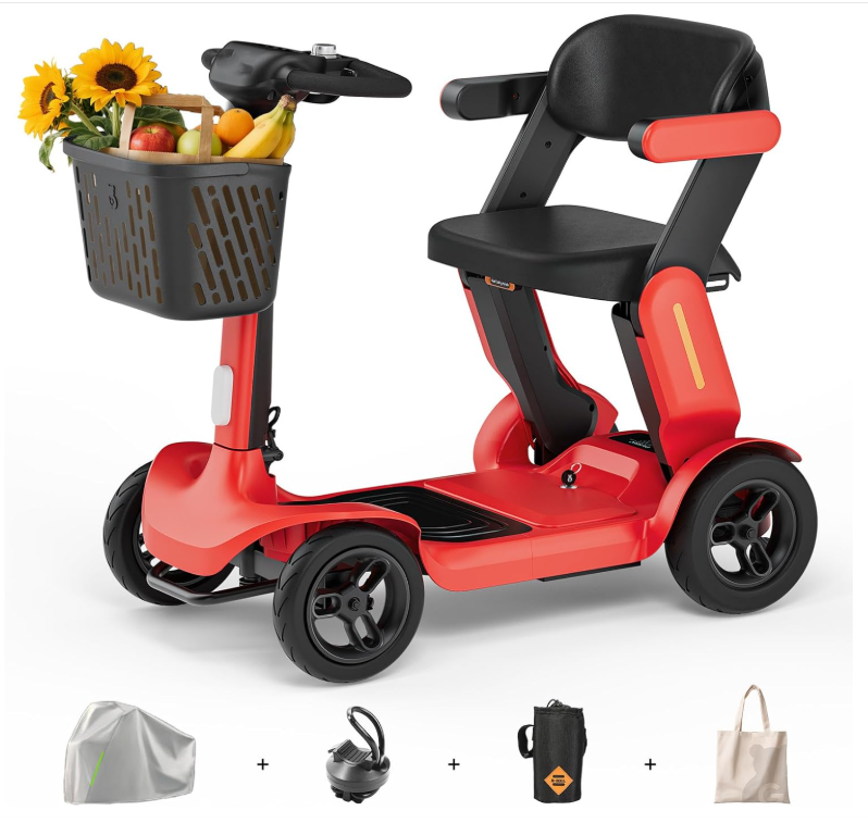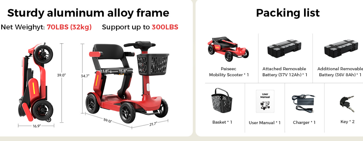 🚗【Quick-Folding & Portable Storage】With its patented 2-step folding mechanism, this lightweight foldable mobility scooter can be collapsed to 39” x 22” x 17” in seconds—no tools required. Weighing only 70 lbs (heaviest part 61 lbs), the compact mobility scooter fits easily into most car trunks, making it the perfect travel scooter for days out, visits, or trips. Take your independence with you wherever you go!