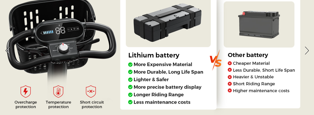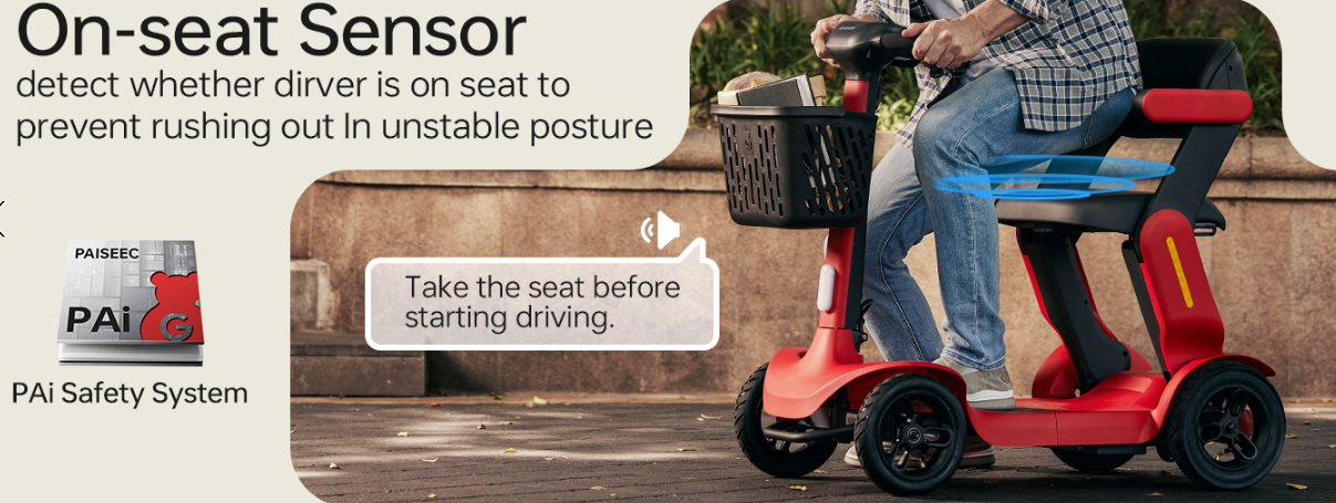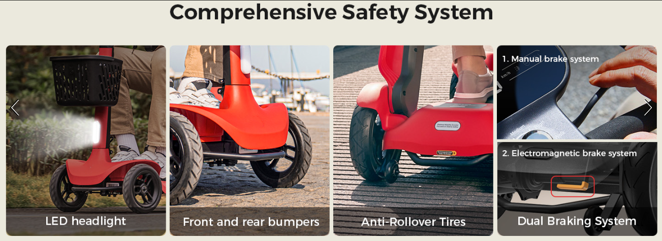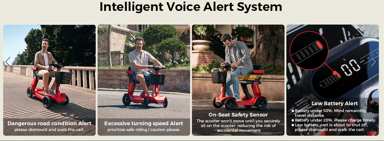 🤖【AI Safety System for Stable Riding】Ride with peace of mind thanks to the advanced AI Auto Speed Control and Voice Alert System. Designed for older adults and individuals with limited mobility, the mobility scooter willautomatically adjusts speed during starts, turns, and downhill descents to prevent tipping. Real-time voice alerts notify you of low battery, high speed, or unsafe terrain—so you can focus on enjoying a smooth and secure journey with our mobility scooter for seniors