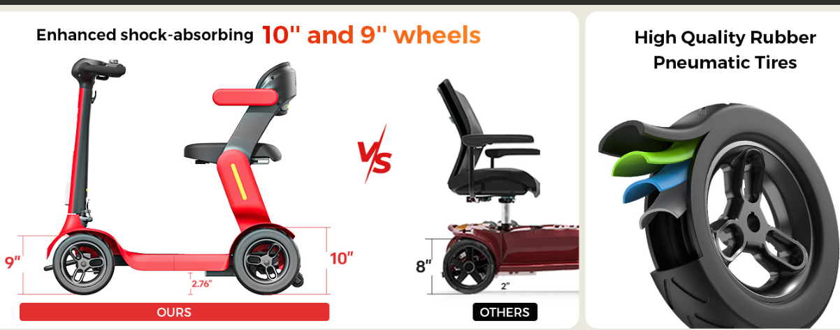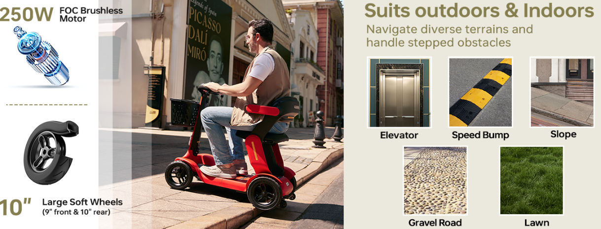 🚜【300LBS Capacity | All-Terrain Comfort】Made of premium aluminum alloy, our electric mobility scooter with load capacity up to 300 LBS. Equipped with 250W powerful brushless motor and enlarged 10'' and 9'' air-filled wheels, our powered mobility scooter features great traction and better wear-resistant and shock-absorbing function, thus support more comfortable and more stable driving experience in various terrains, such as grass, damaged concrete pavements or rocky roads
