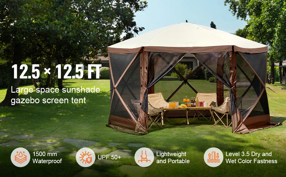 large camping gazebo tent can fit up to 8 people inside, constructed of waterproof 300D oxford fabric and bite-proof B3 gauze netting.
