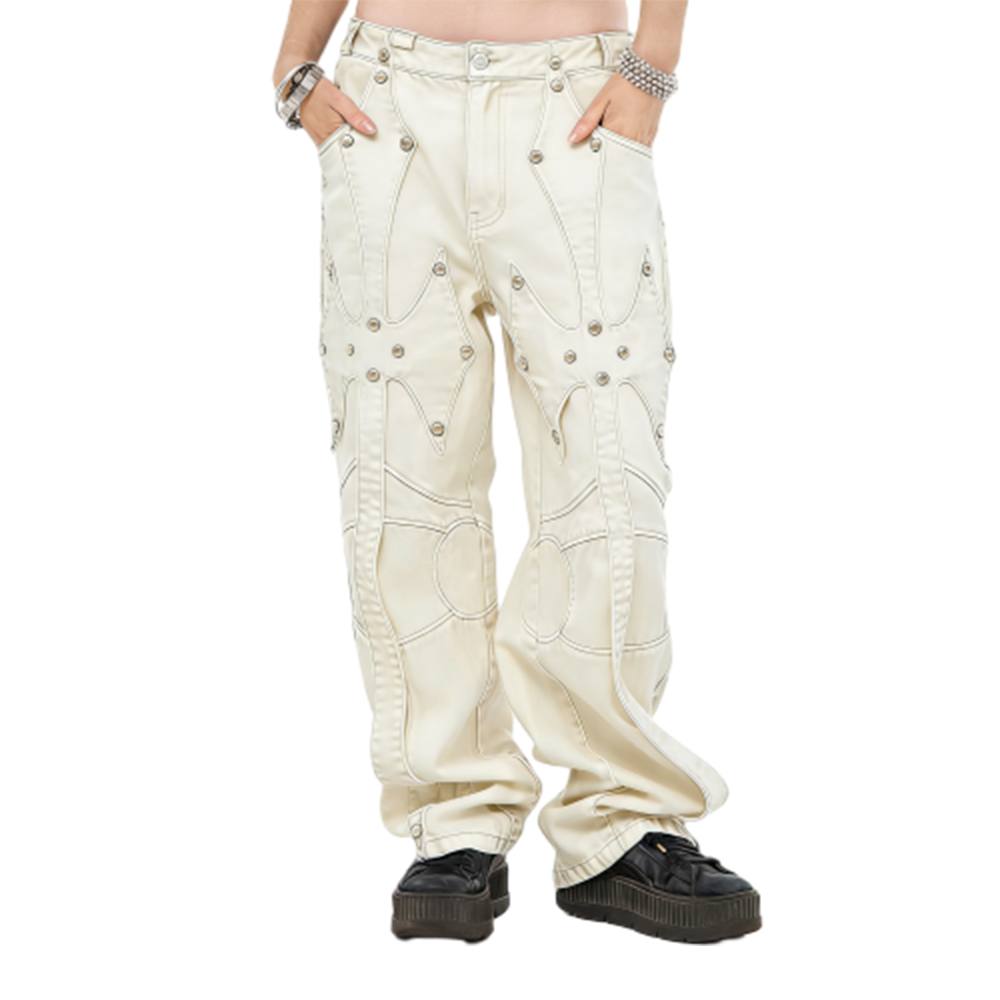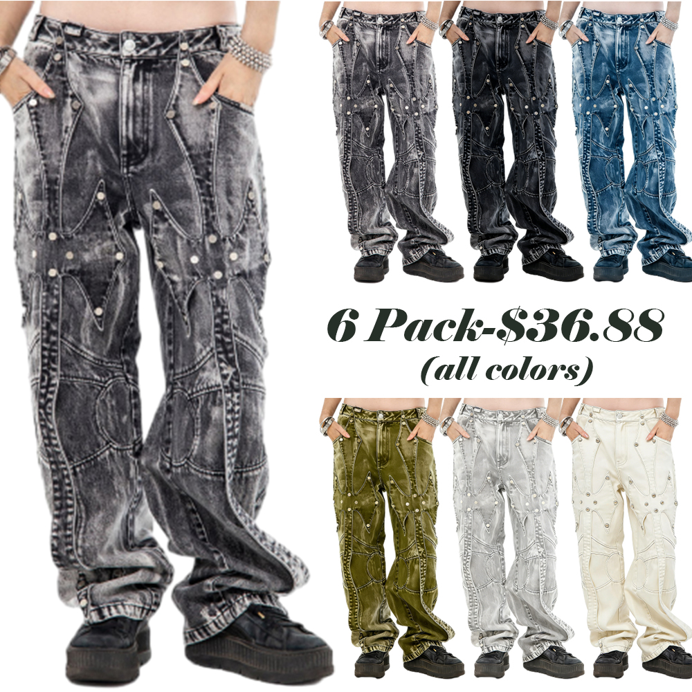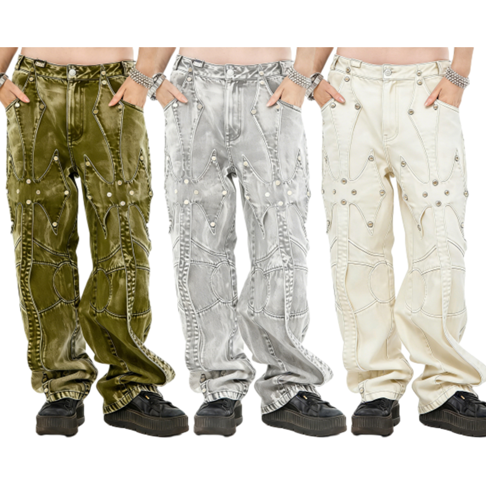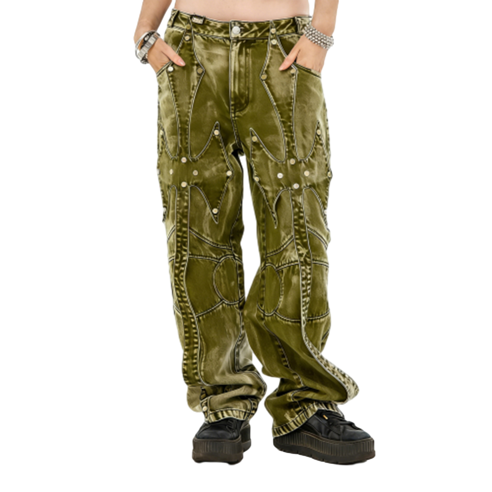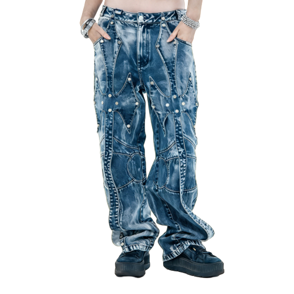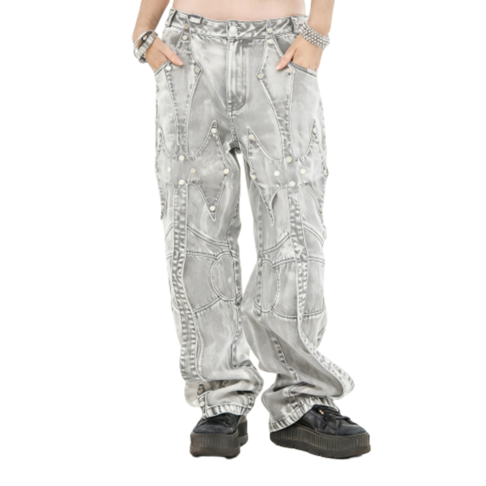 Divine Jeans blend trompe l'oeil splatter detailing with a dirty mineral tint across heavy-weight denim. Detachable reversible cross patches secured by custom silver snaps allow for versatile styling, while a chenille wax seal adorns the back waistband. Double-layer back pockets feature raw-edge finishes and cutout details, complemented by a black satin embroidered inner fly and silver metal emblem on the leather pocket patch.